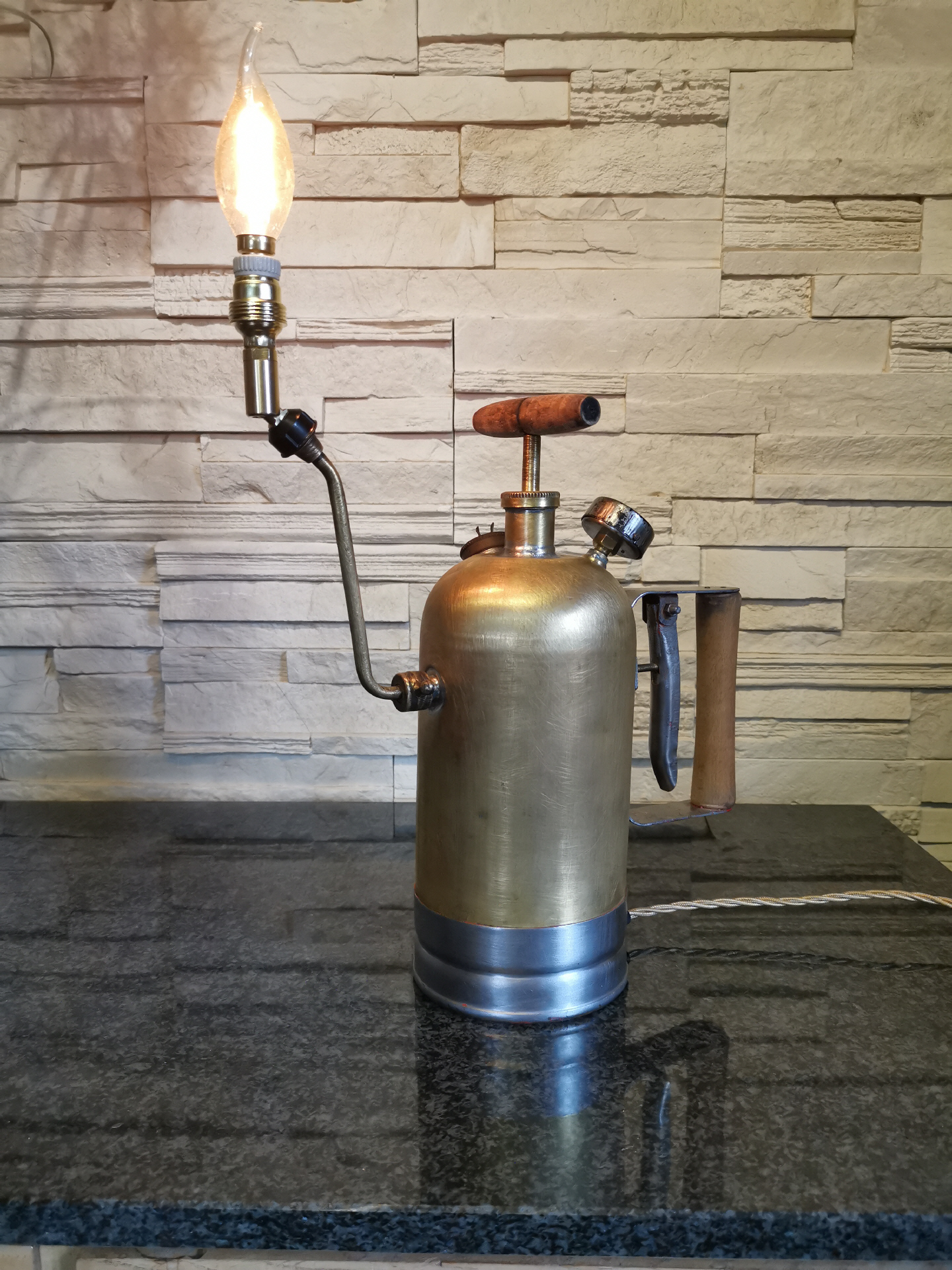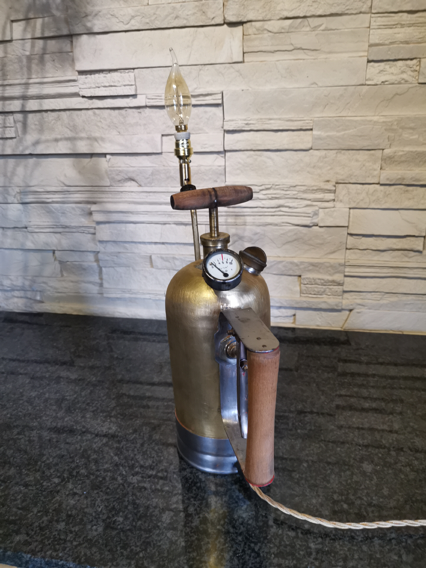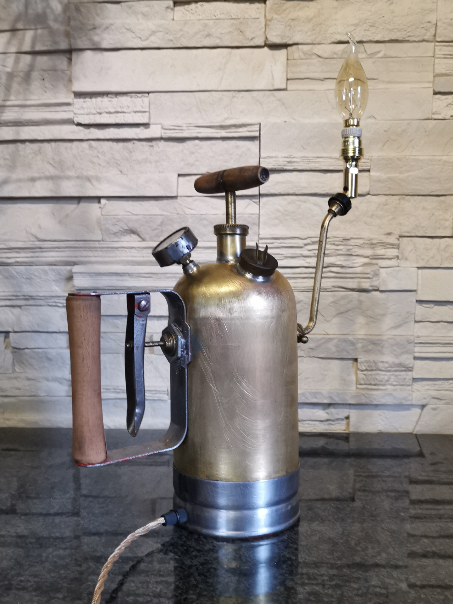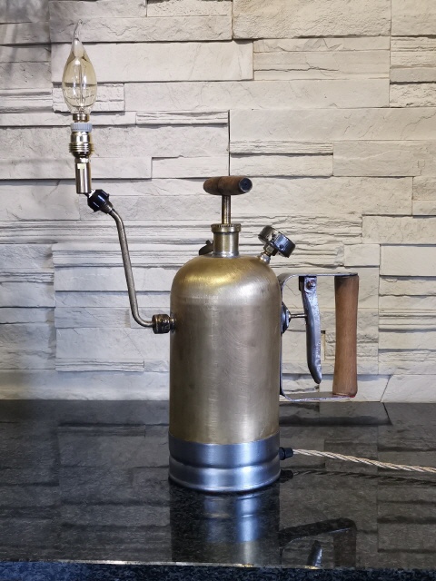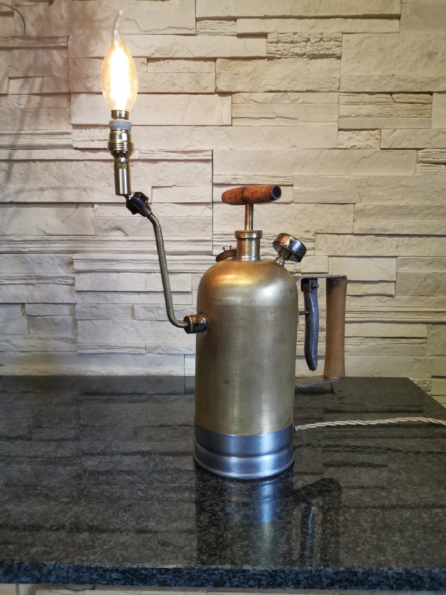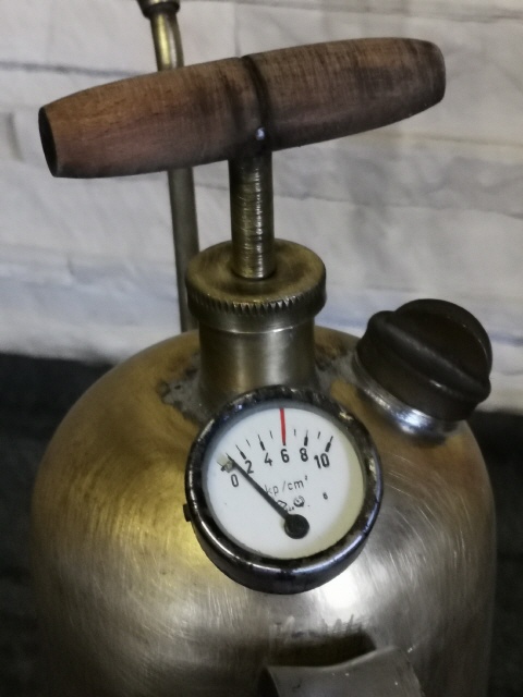 Auf einem Flohmarkt wurde ich auf diese alte Pflanzen-Spritze aus der ehemaligen DDR aufmerksam. Blau und Rot lackiert, machte sie einen eher unscheinbaren Eindruck, allerdings erhaschte ich, durch eine Beschädigung am Lack, einen Blick auf das Material. Schnell wurde man sich handelseinig und die Arbeit begann.