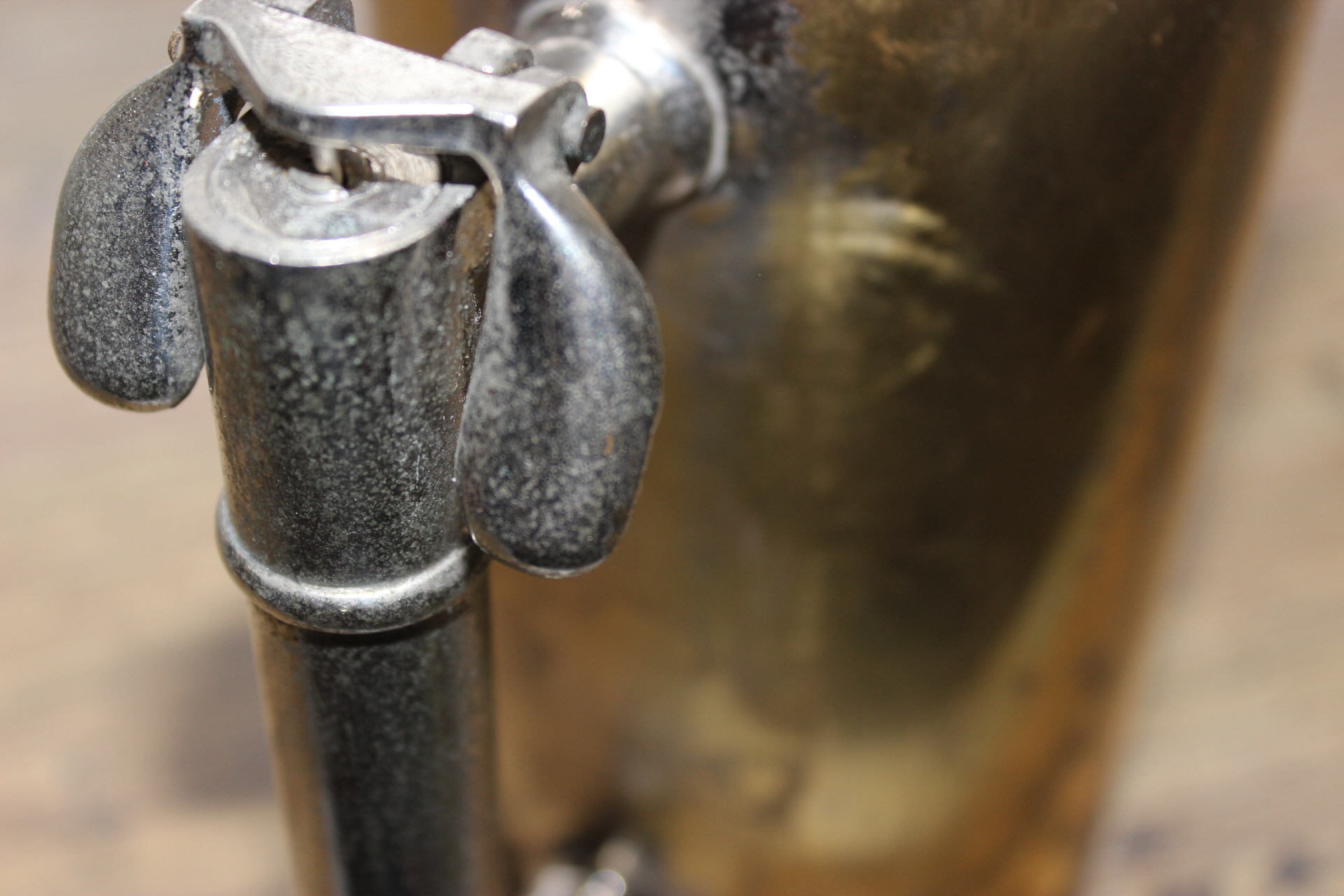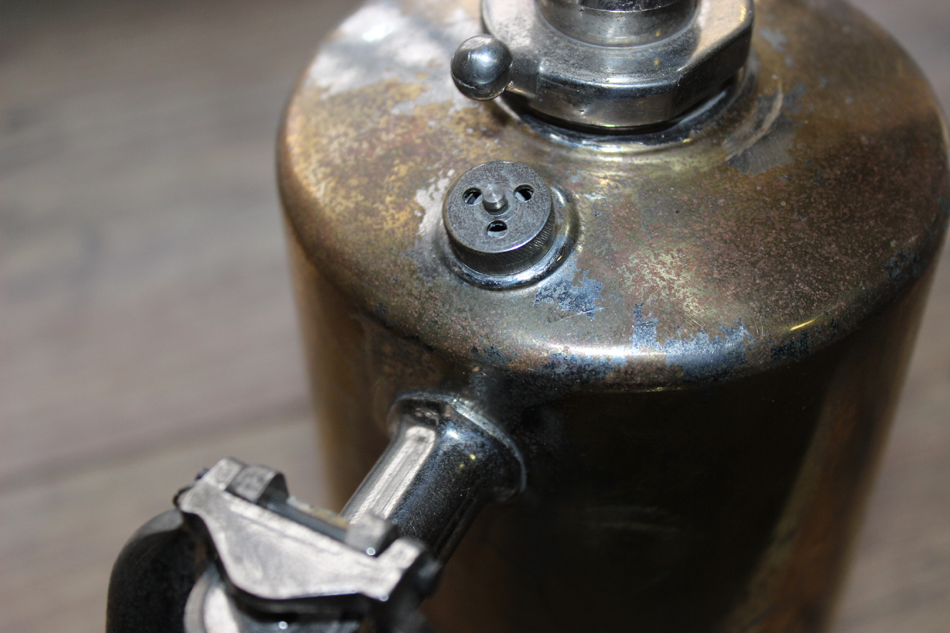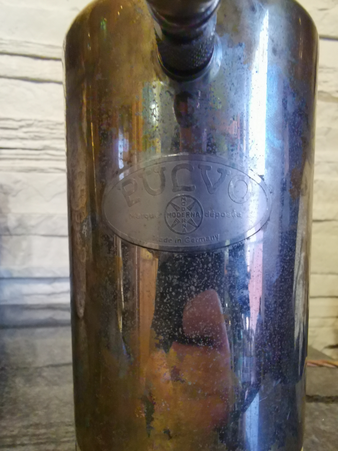 Pulvo Zerstäuber Moderna Pulverisator antike Pflanzenspritze Made in Germany. Grundbehälter im Durchmesser 10 cm und 17,5 cm hoch (ohne Pumpe gemessen) - aus Messing gefertigt und dann vernickelt oder verchromt. Veredelung großflächig abgerieben - Messing kommt zum Vorschein. Pumpe ohne Druckaufbau. Alles dreh- und bewegbar, was dreh- und bewegbar sein soll. Guter Zustand.