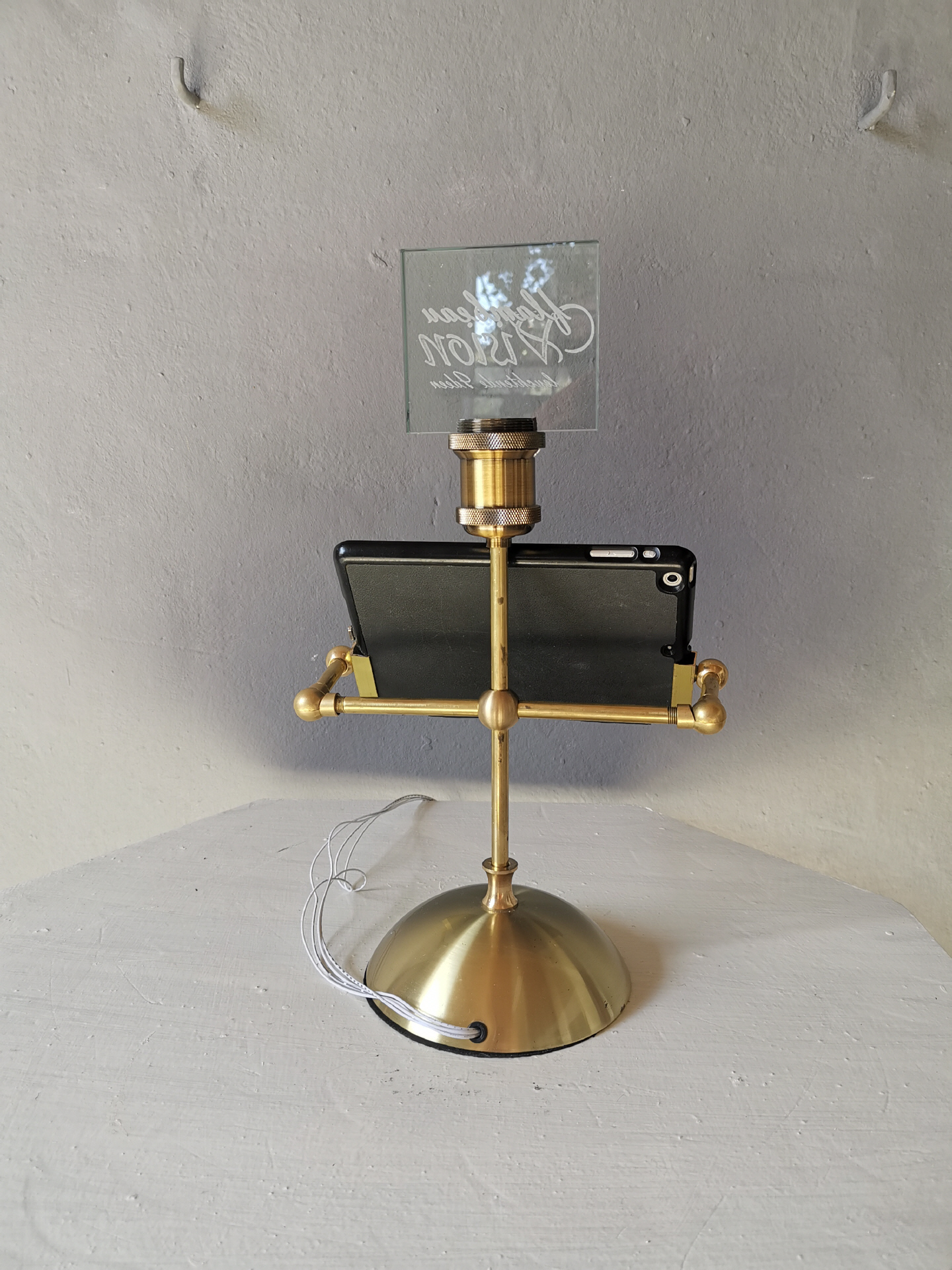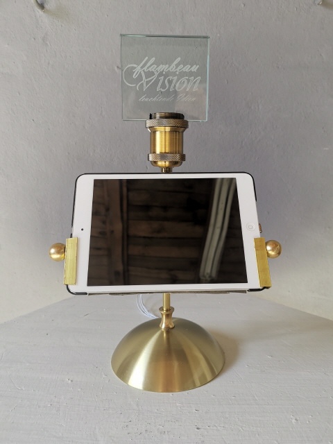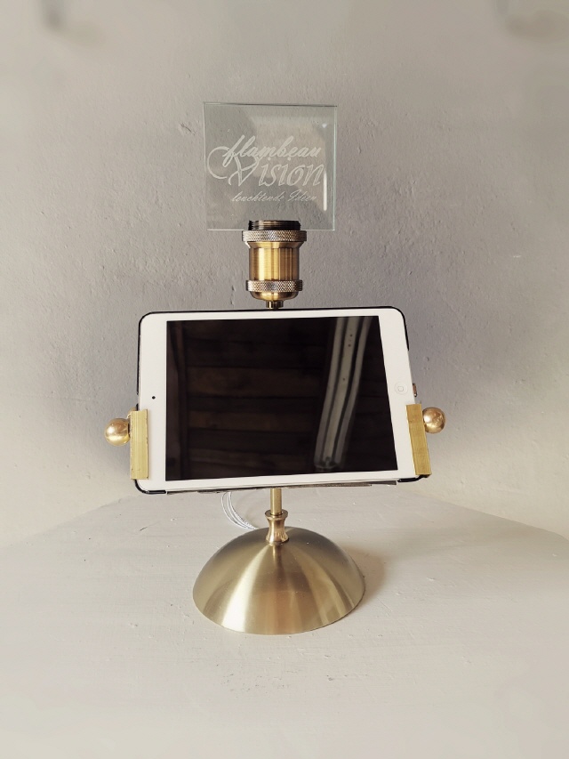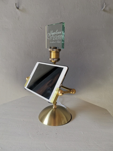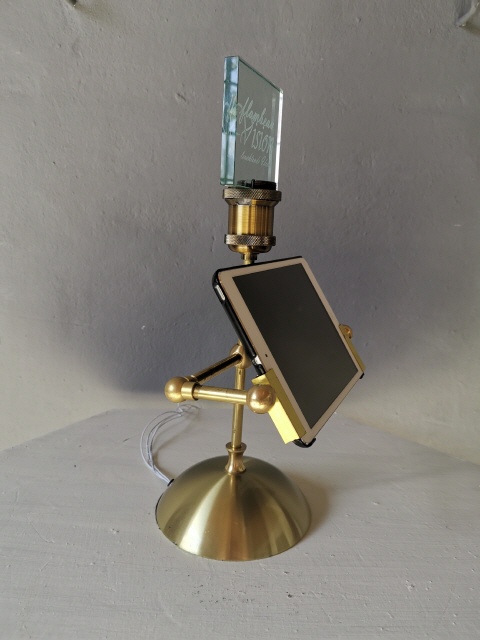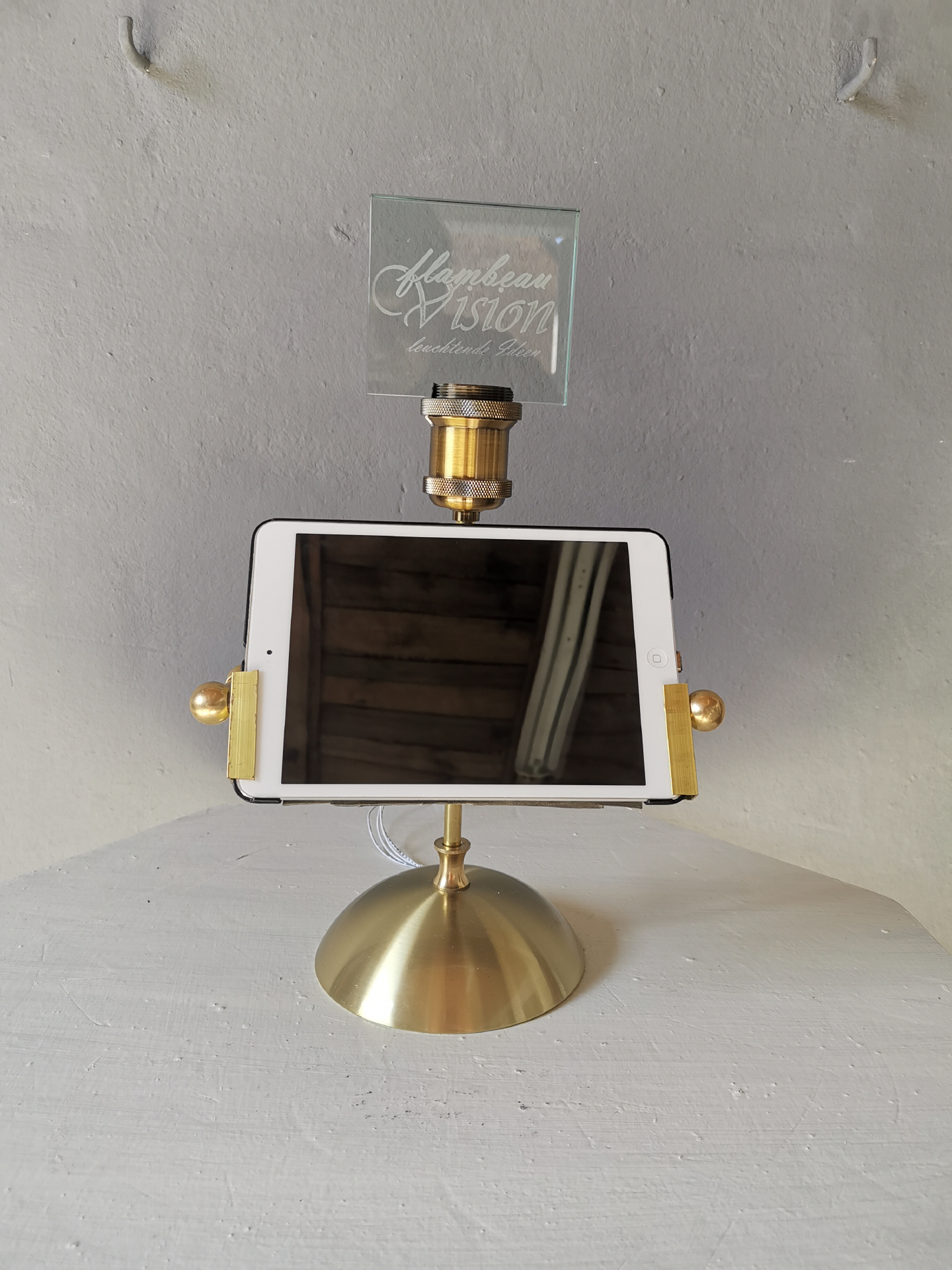 Aufgebaut um alte Tablets aufzunehmen, die als Fotorahmen durchaus ihren Dienst noch sehr gut verrichten. Oben habe ich ein Acryl Glas Block mit eingelaserten Logo.