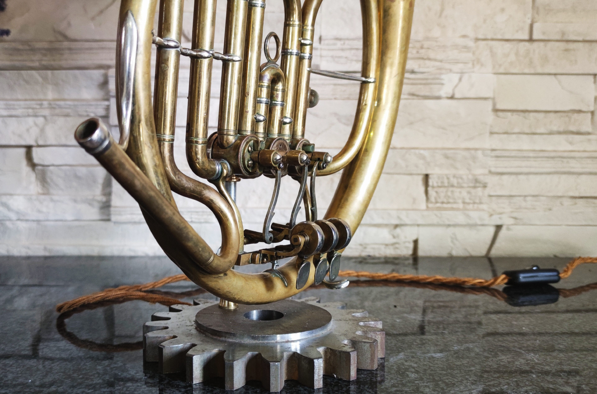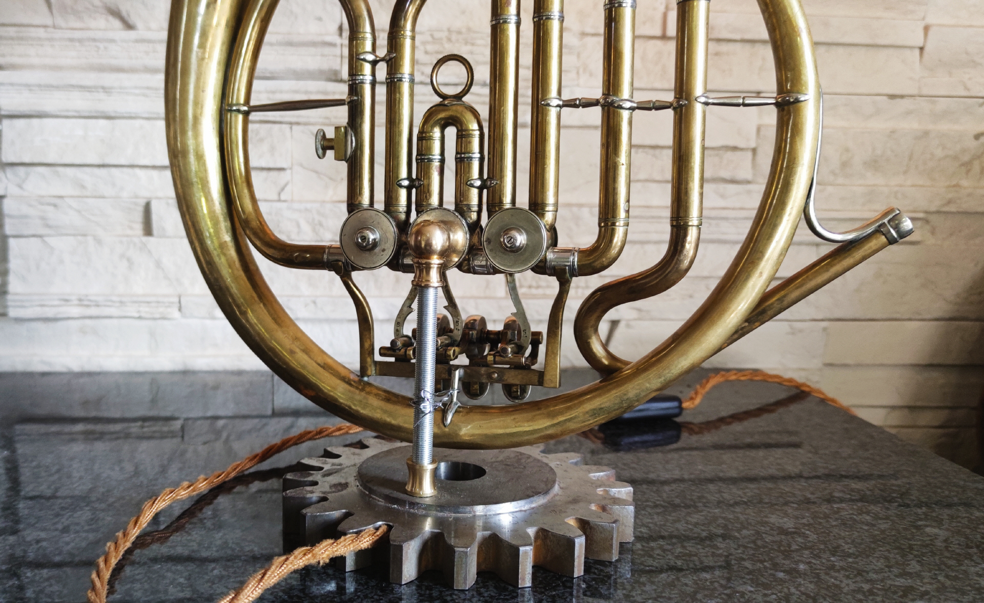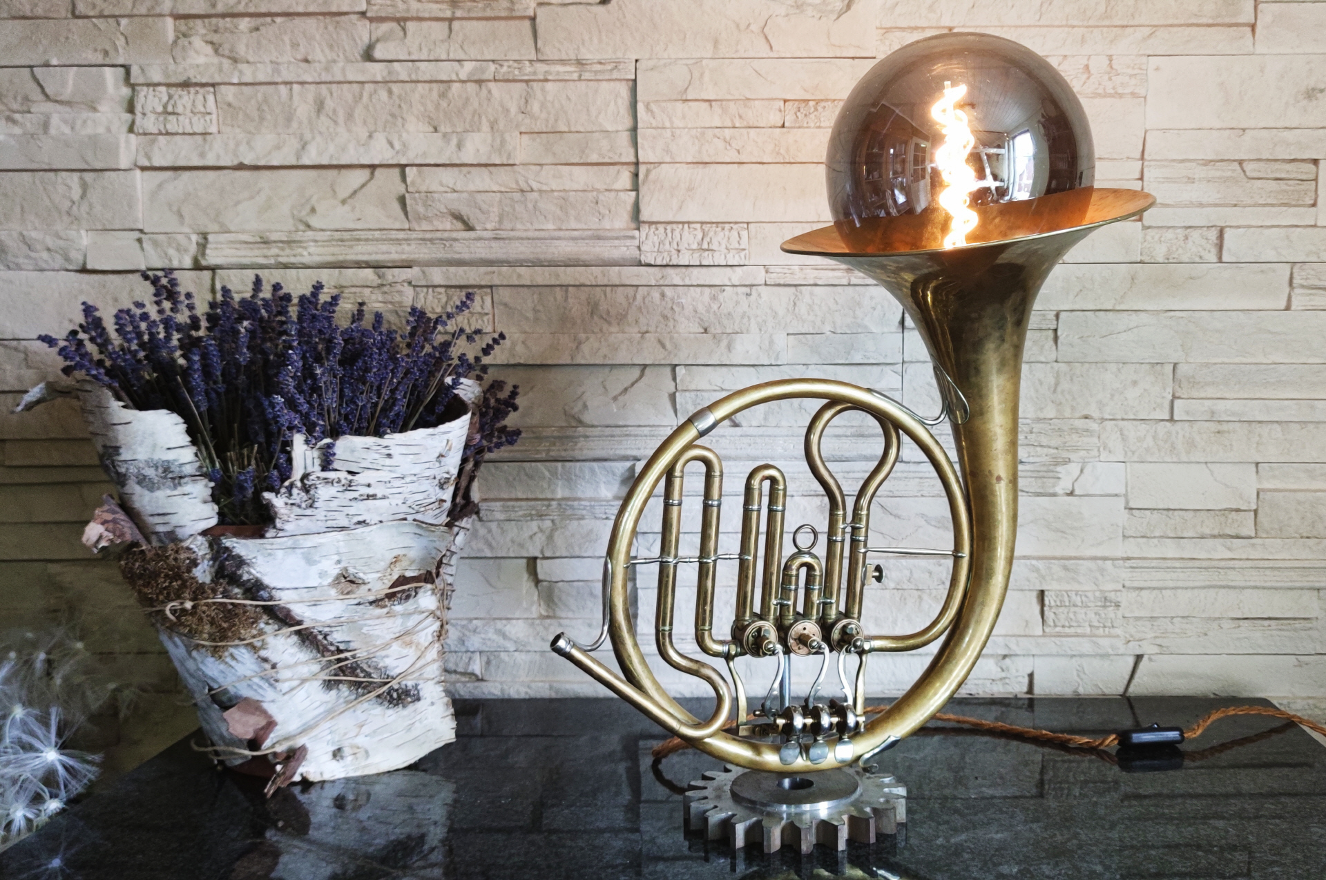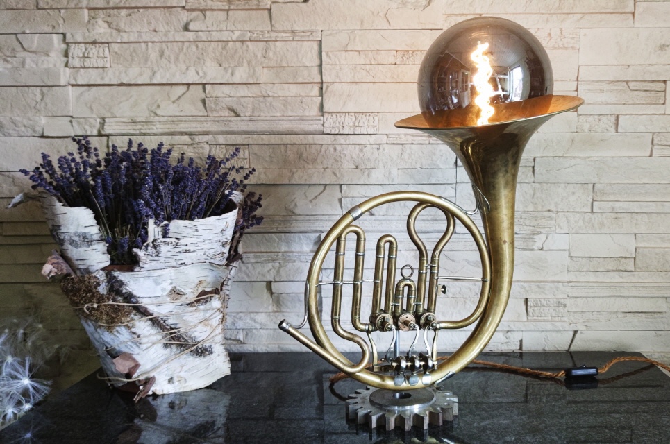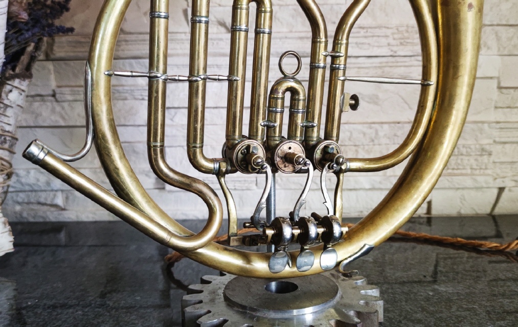 Dieses schöne Drehvemtil Horn habe ich zu dieser einzigartigen Lamüe umbauen dürfen. Als Sockel dient ein altes Zahrrad aus massivem Metall.